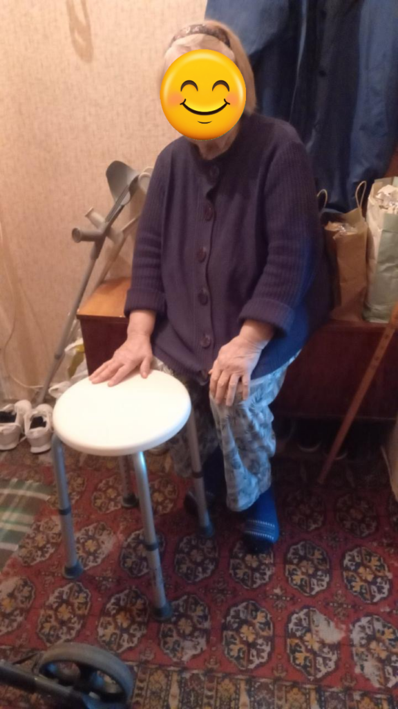 Eine ältere Frau in Saporischschja hat von uns einen Duschstuhl bekommen.