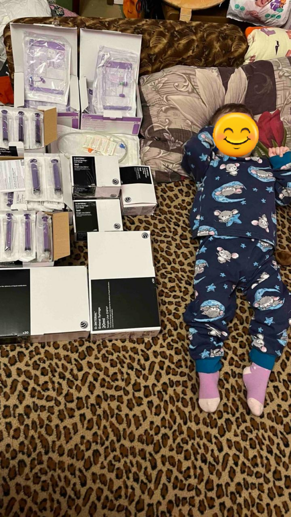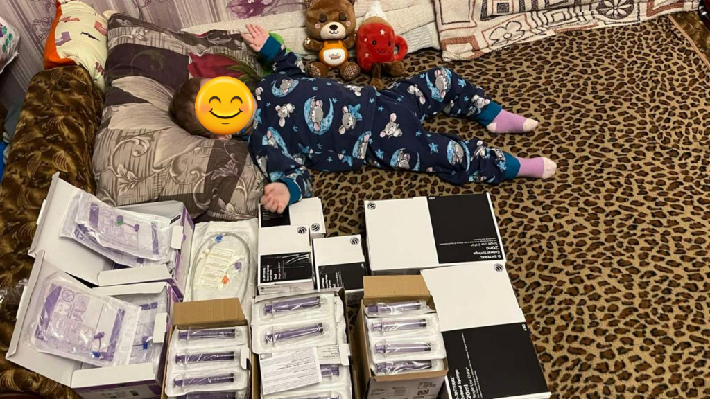 Ein Junge hat von uns medizinische Unterstützung in Form von Spritzen und Zubehör für Sondennahrung erhalten.
