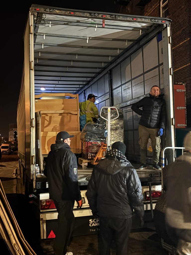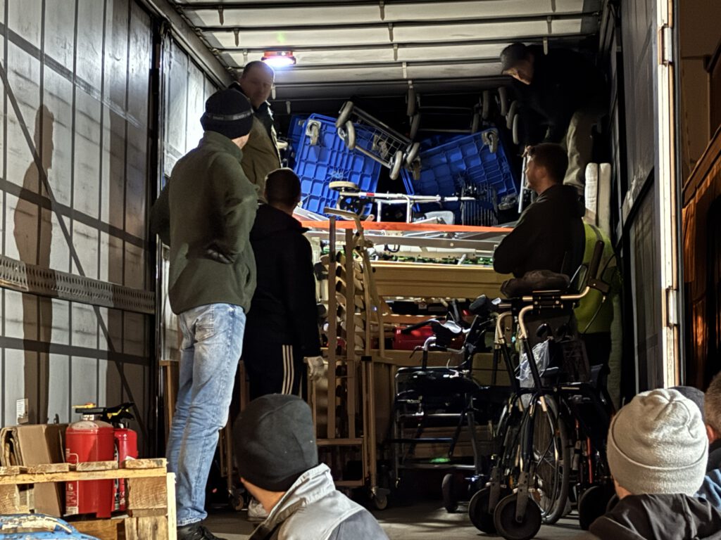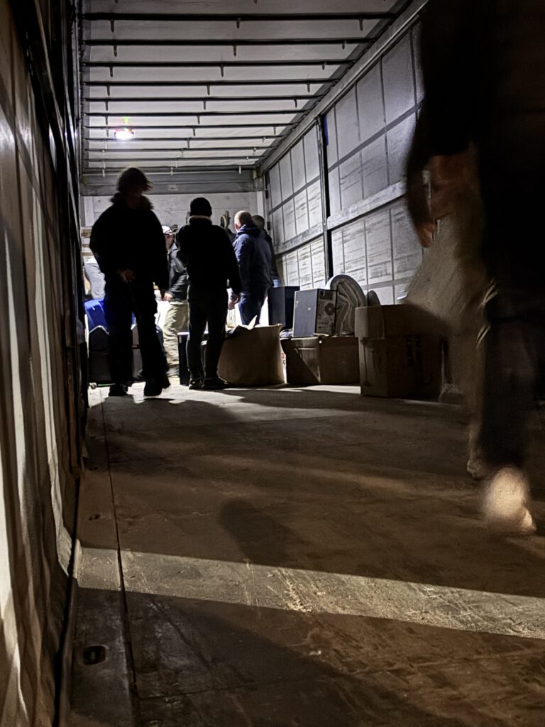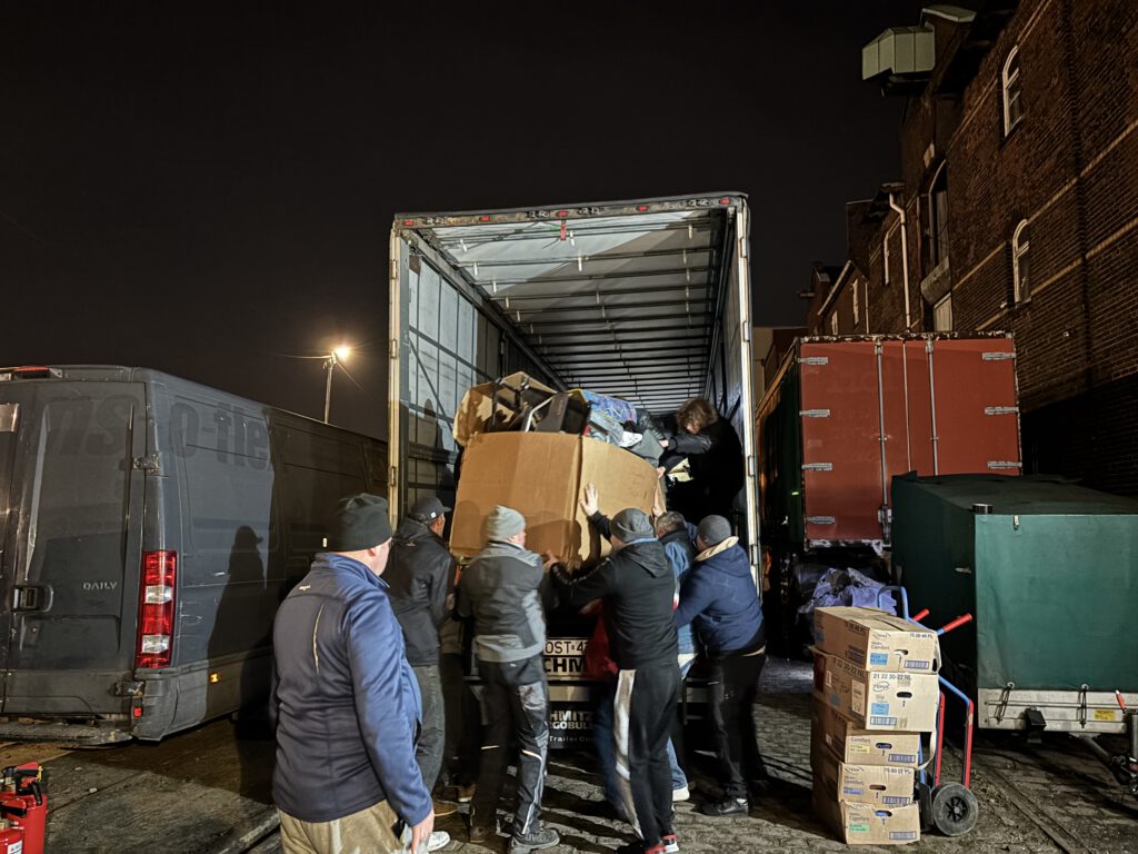 Nachdem der 13. LKW komplett beladen wurde fuhr der 14. LKW vor. Nach einer kurzen Pause ging das gesamte Team wieder an die Arbeit. Und erneut wurden die Spenden aus dem Lager zum LKW gebracht und dort verladen.