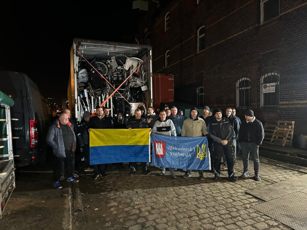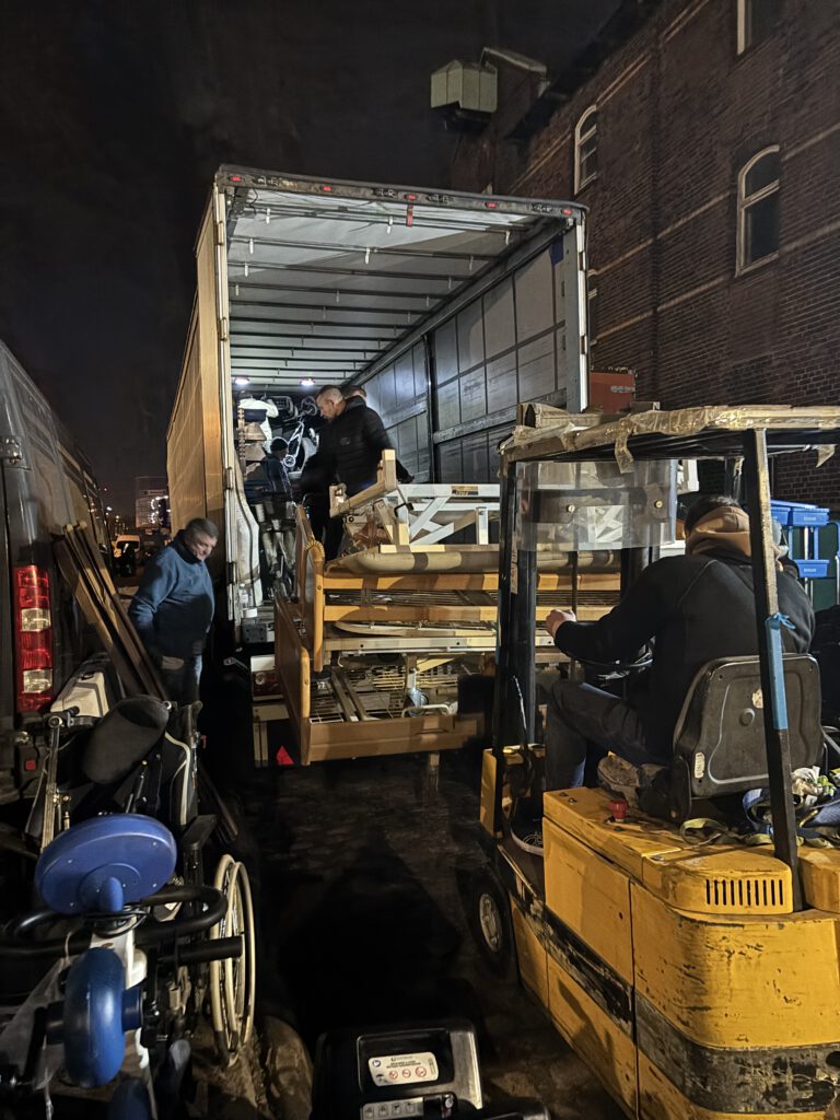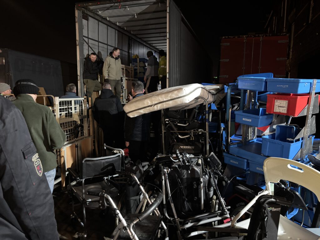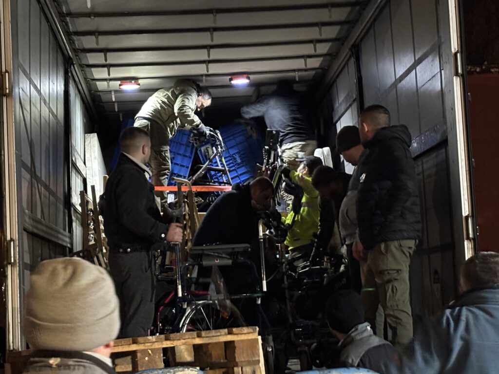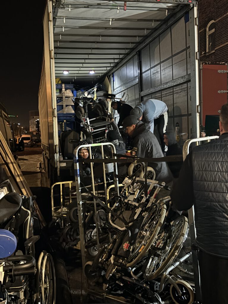 Nachdem der 13. LKW komplett beladen wurde fuhr der 14. LKW vor. Nach einer kurzen Pause ging das gesamte Team wieder an die Arbeit. Und erneut wurden die Spenden aus dem Lager zum LKW gebracht und dort verladen.
