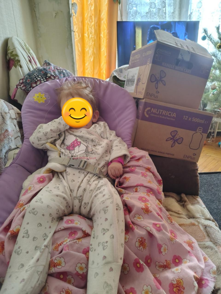 Ein kleines Mädchen in Kyjiv hat von uns Sondennahrung geliefert bekommen.