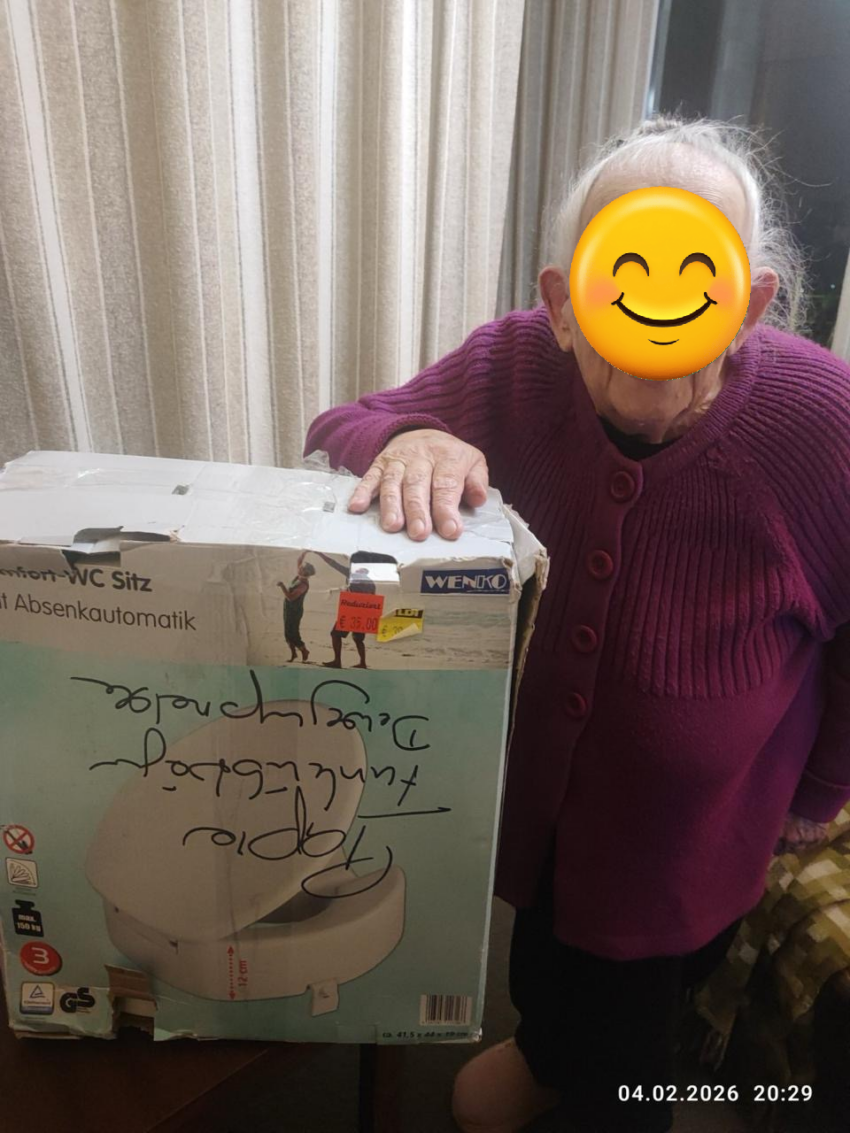 Eine nette, alte Dame aus Kyiv hat einen Toilettenaufsatz für den Eigenbedarf geliefert bekommen.