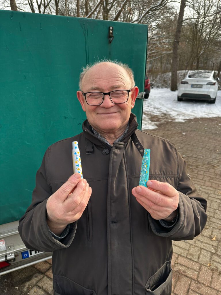 Wir durften erneut viele tolle Spenden von Emil abholen. Als Dankeschön haben wir ihm zwei handbemalte Patronenhülsen aus der Ukraine schenken können.